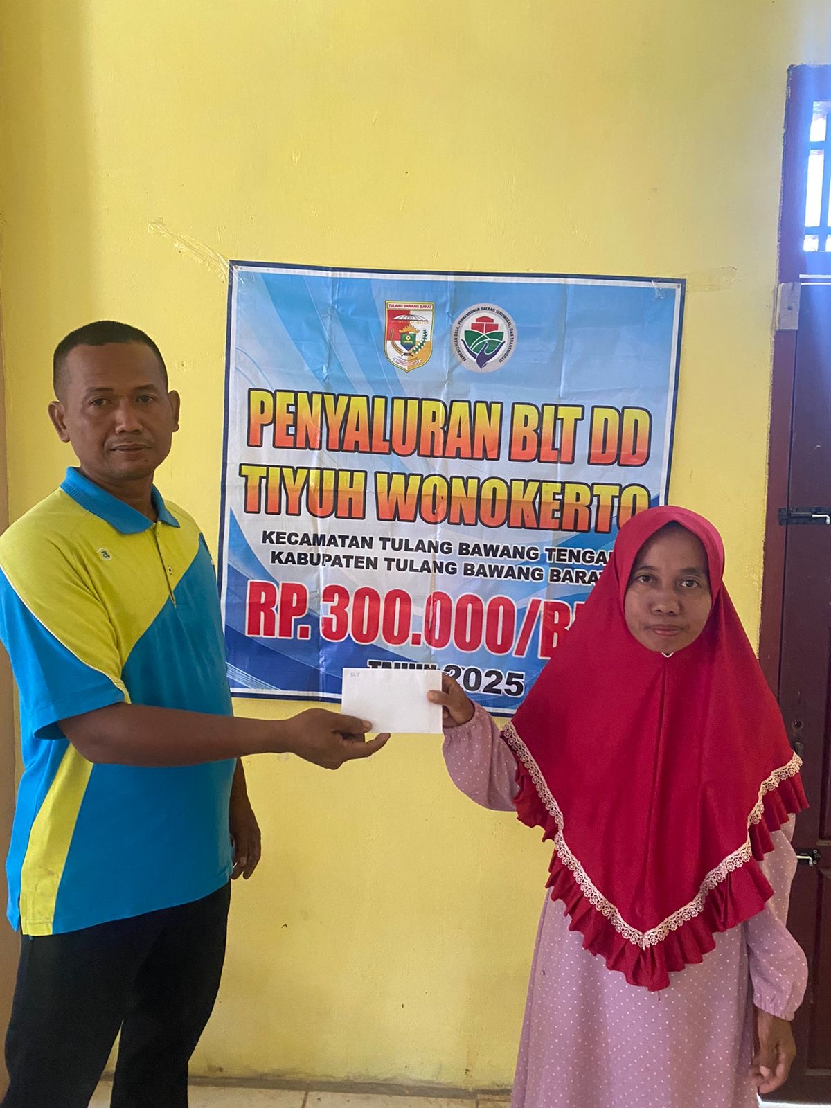 Tulang Bawang Barat-Pemerintah Tiyuh Wonokerto, Kecamatan Tulangbawang Tengah, Kabupaten Tulangbawang Barat menyalurkan Bantuan Langsung Tunai (BLT) kepada 11 Keluarga Penerima Manfaat (KPM).